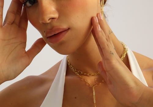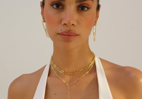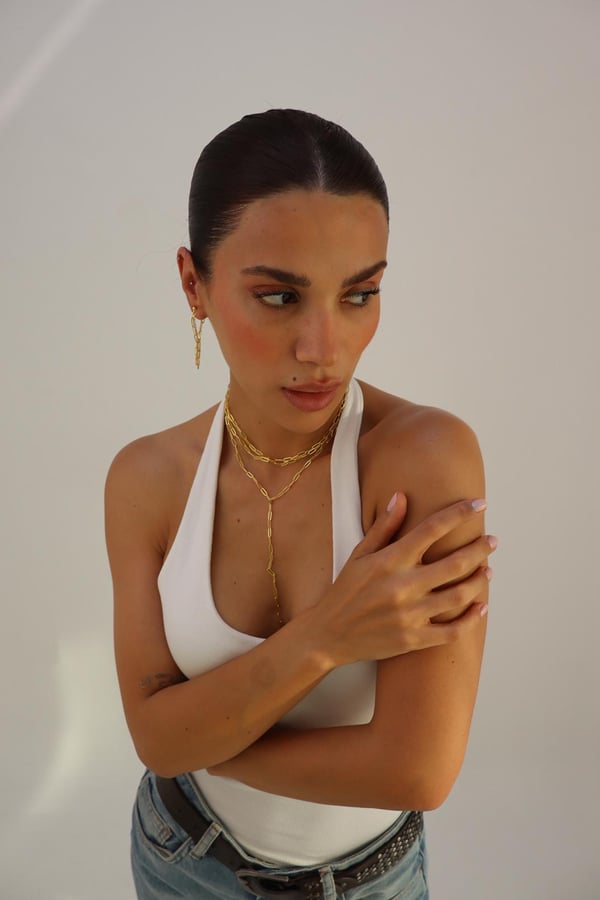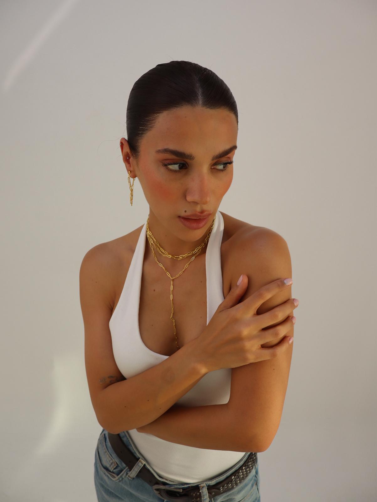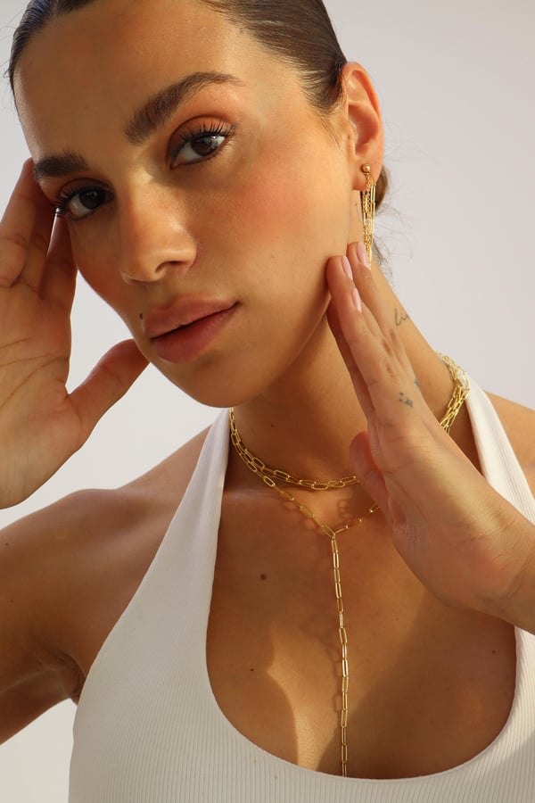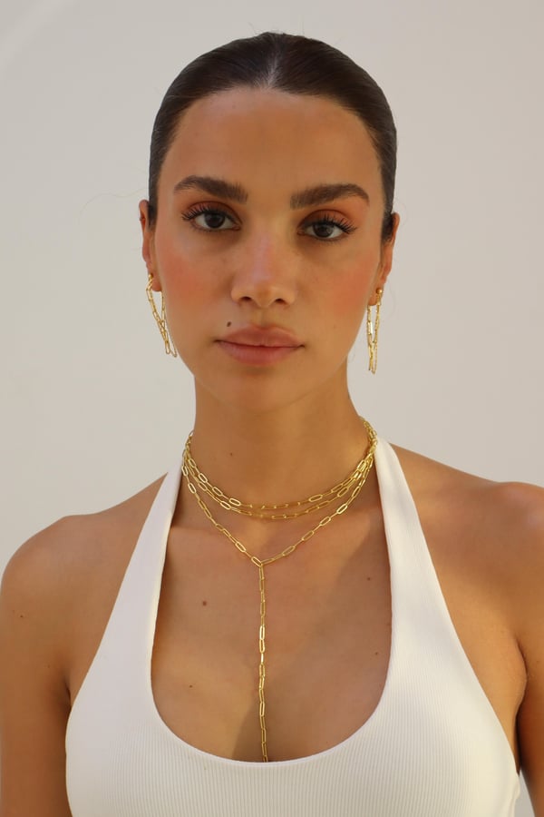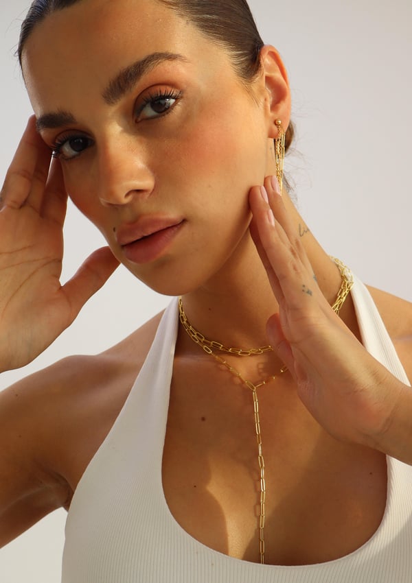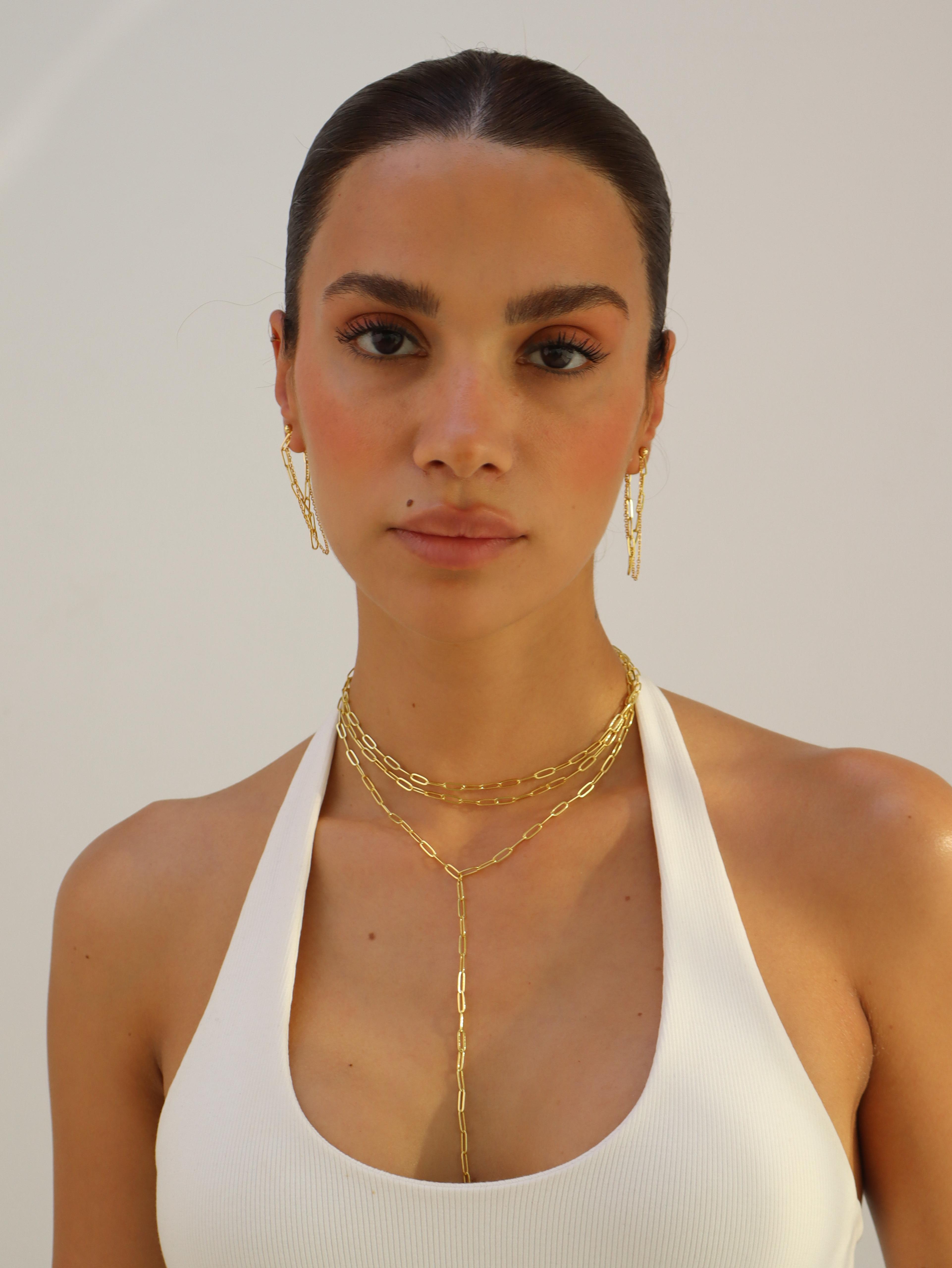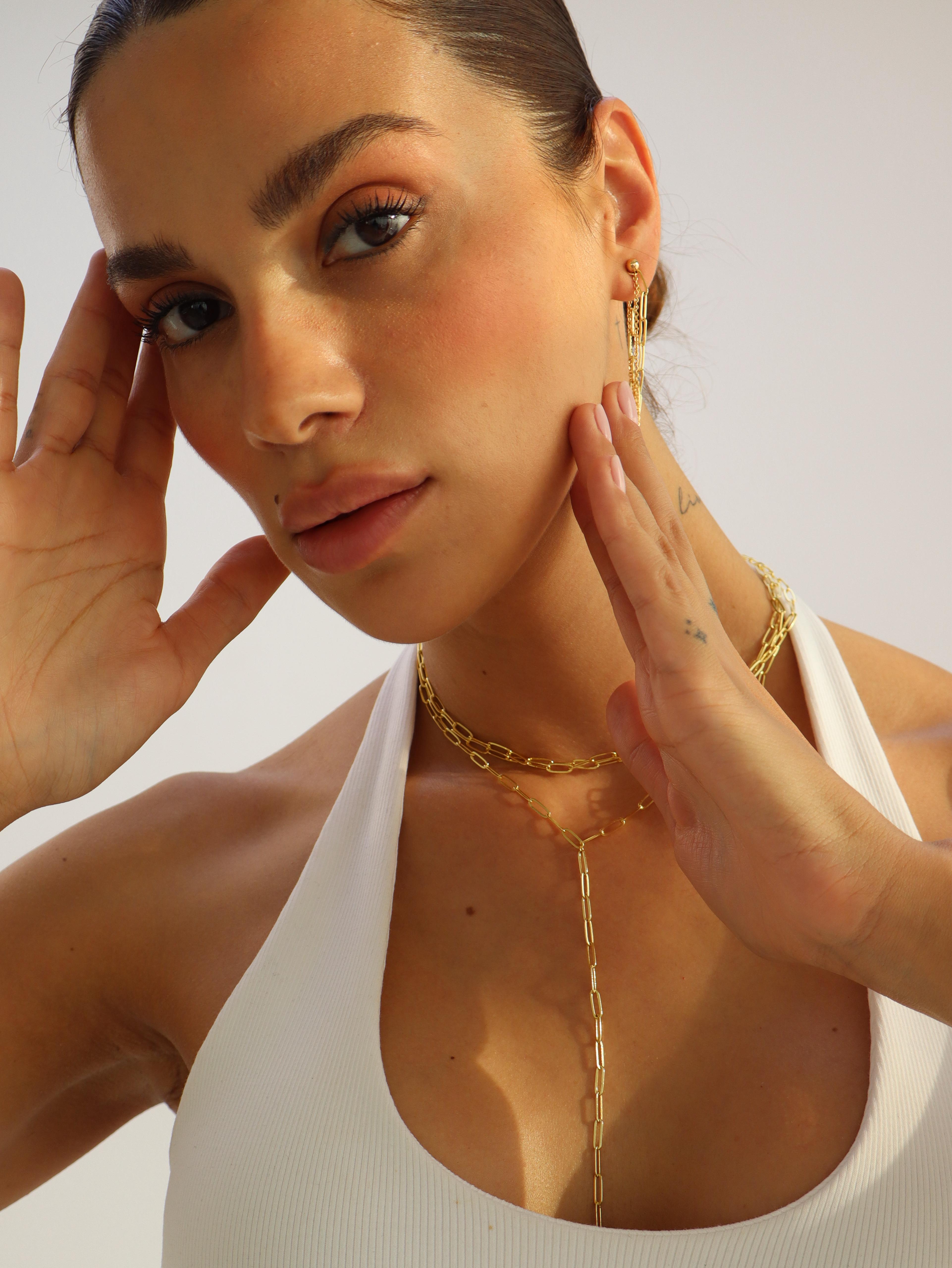 With its bold drop and celestial symmetry, Astra channels modern goddess energy. The Y-shaped gold chain accentuates the neckline with graceful movement.