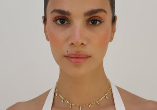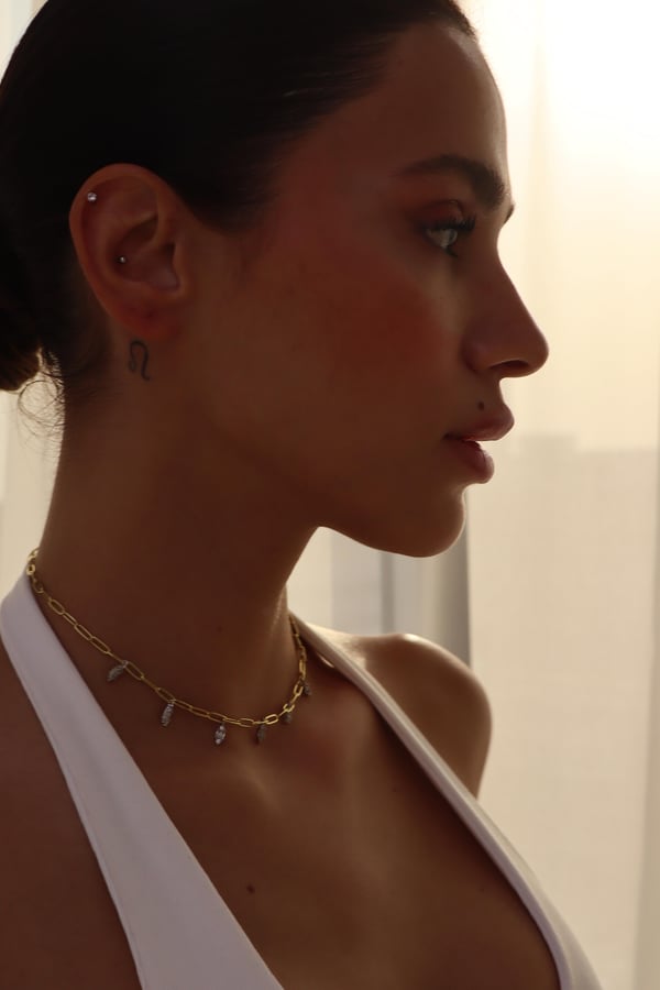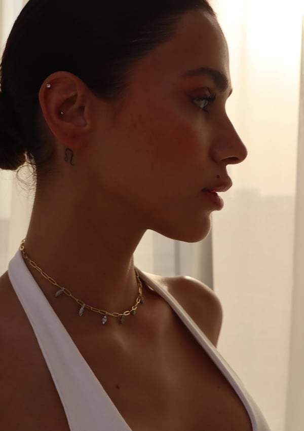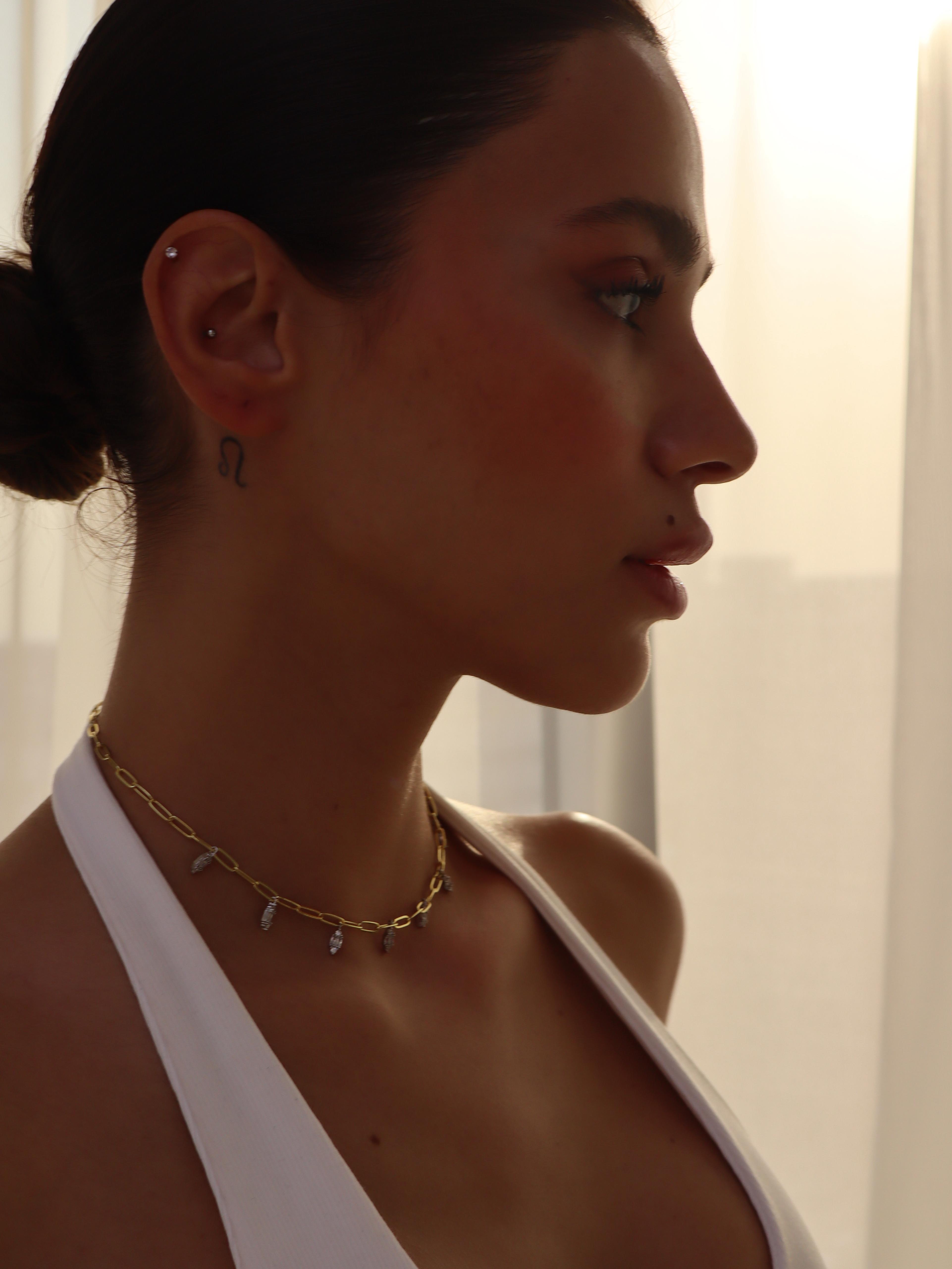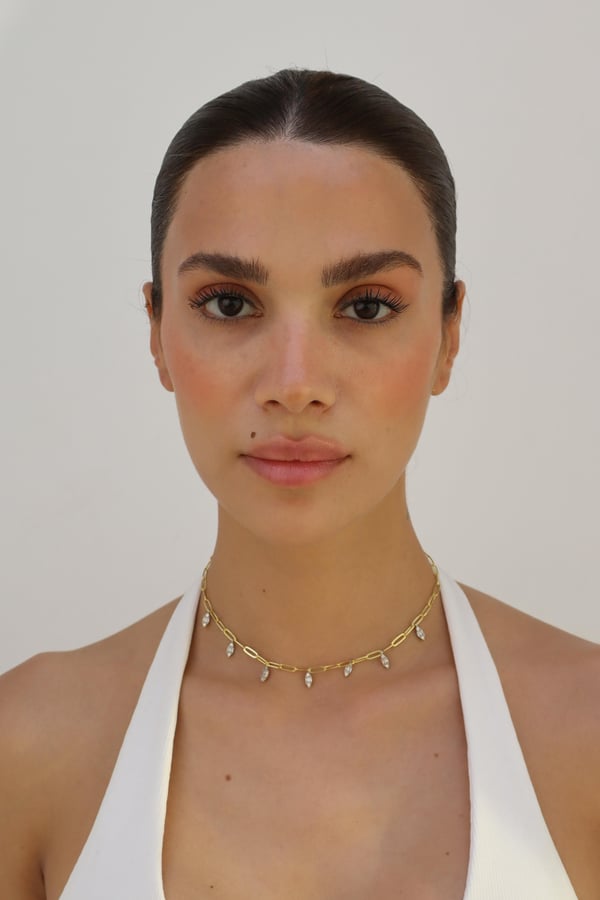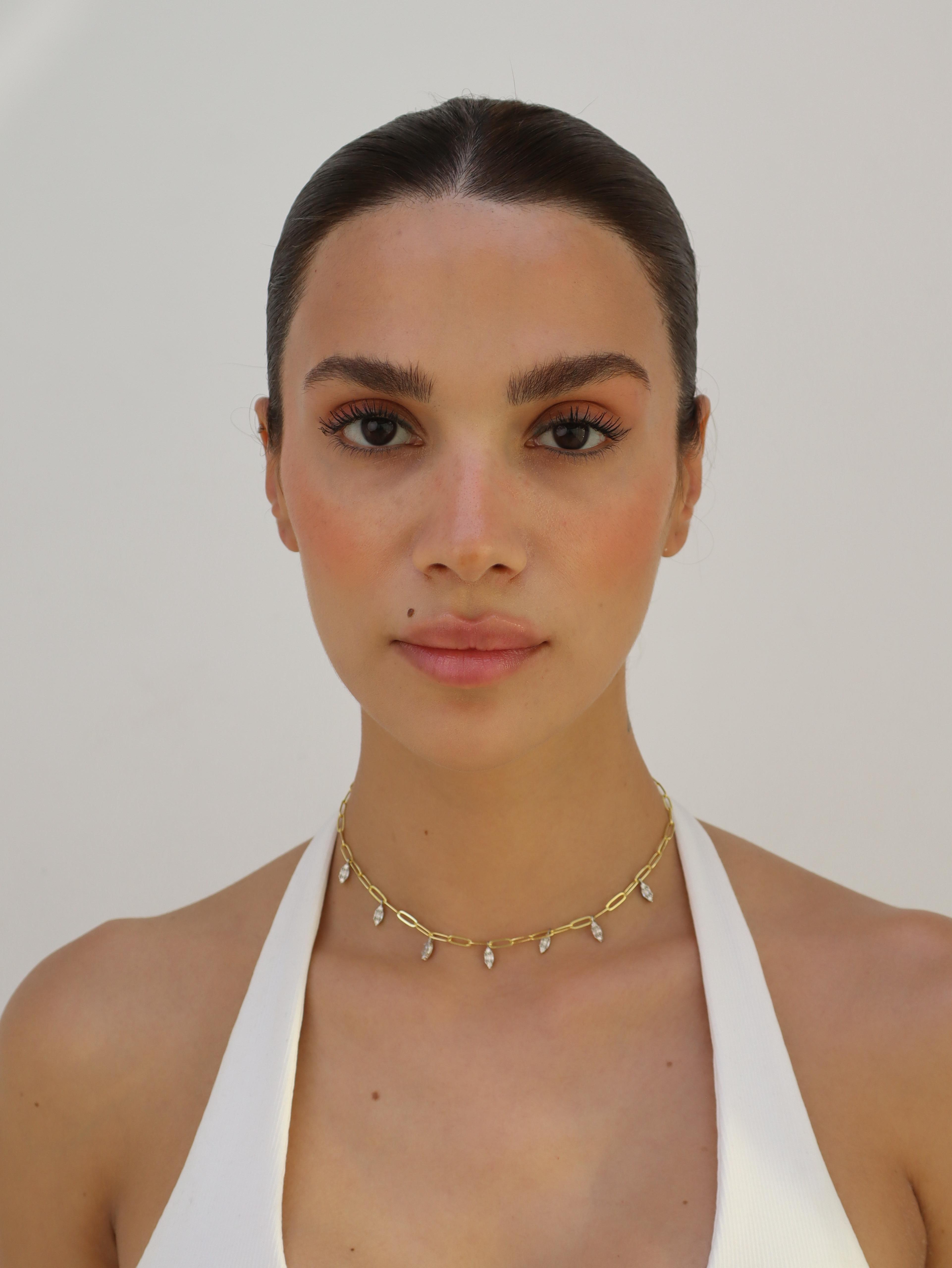 Dew captures light like morning drops on petals, a gold choker adorned with crystal teardrops that shimmer subtly with every move. Understated yet ethereal, this piece brings fresh delicacy to your everyday gold.