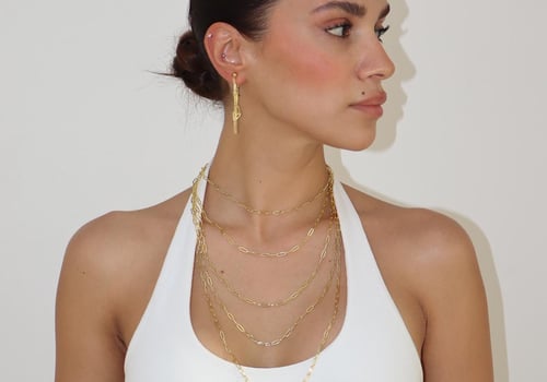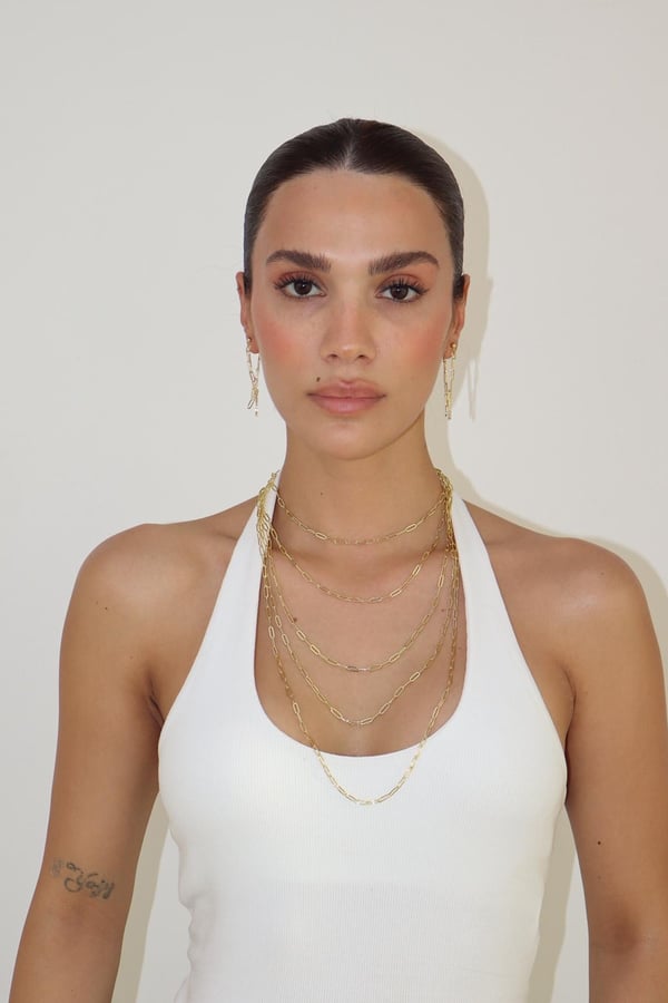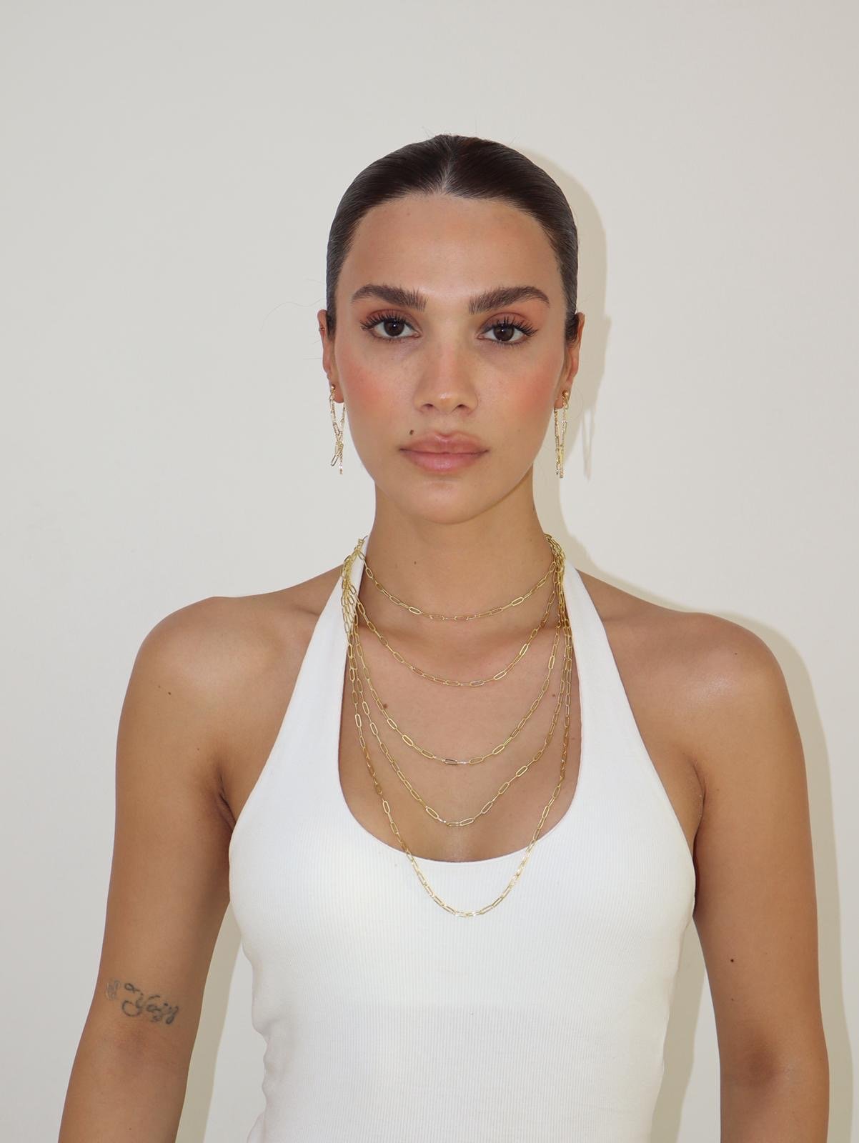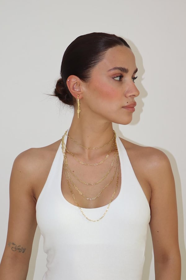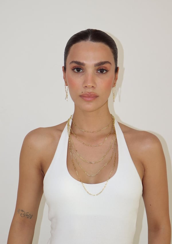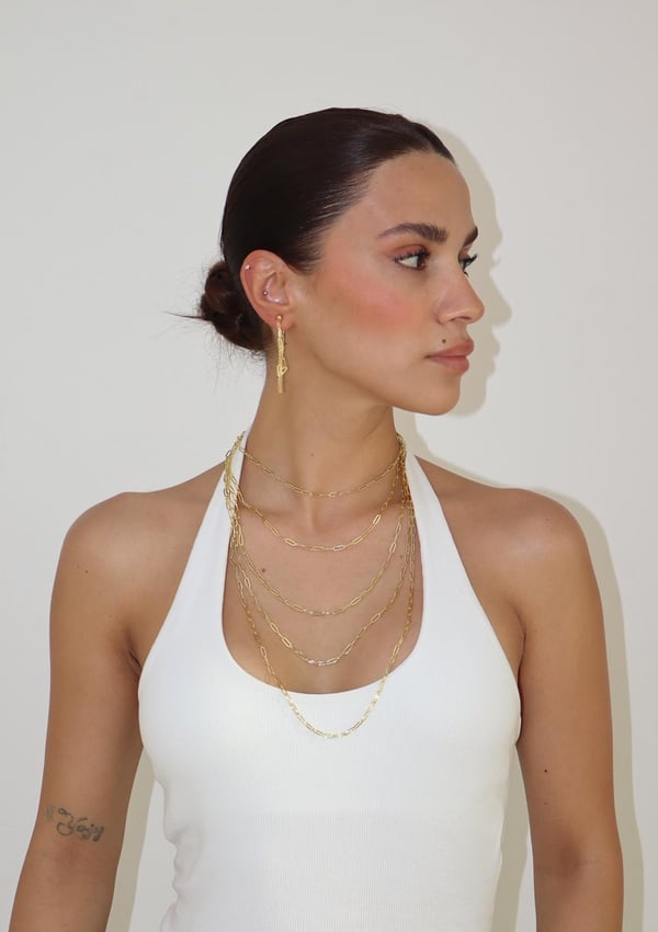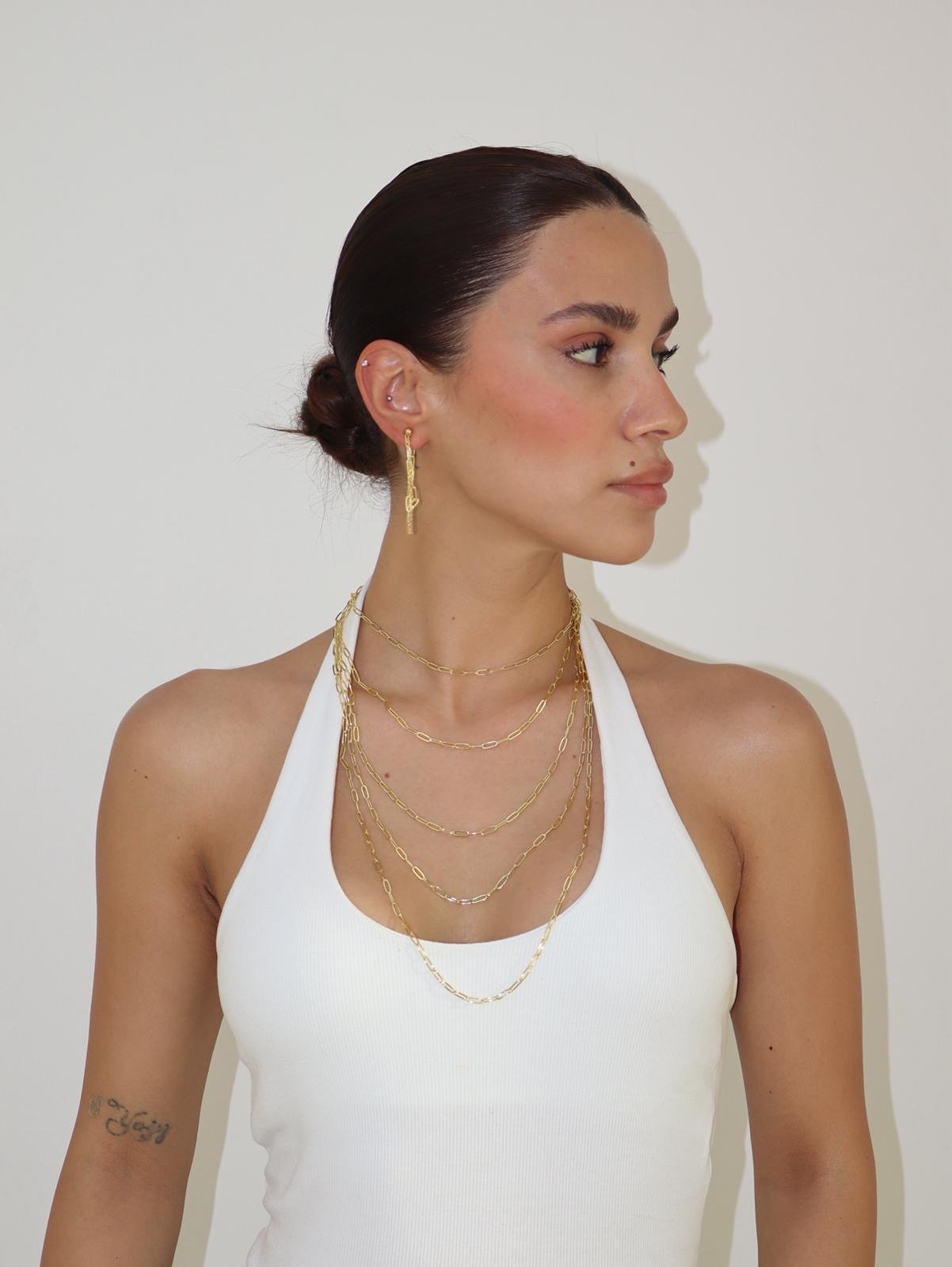 A delicate cascade of layered gold chains, Serene exudes effortless elegance. Lightweight yet striking, this piece is perfect for stacking or wearing solo for a soft, luminous statement.