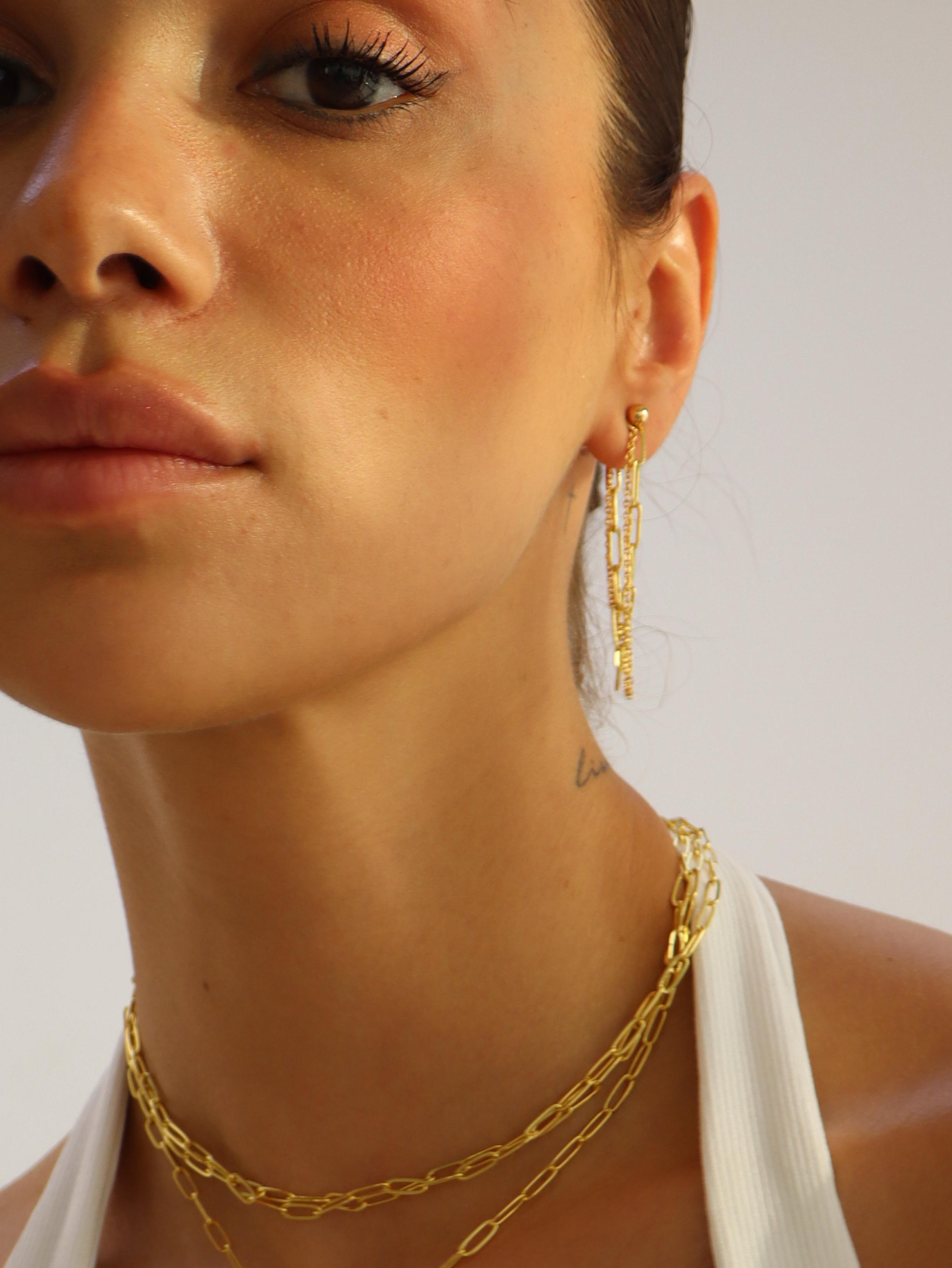 Veyra redefines elegance through motion. Crafted with cascading gold chains of varied textures, these earrings strike a balance between structure and softness. Effortlessly fluid yet full of character. Designed for elevated everyday wear, they blend softness with bold geometry for a look that feels effortlessly powerful.